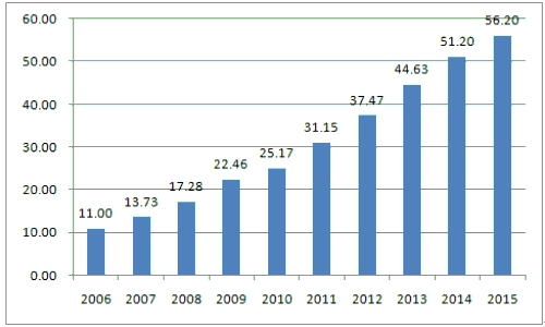 從歷年建筑裝飾產值與全國GDP比重上看,該比重基本在5%上下浮動,近幾年呈小幅上升變動。自2006年至2015年,全國建筑裝飾行業工程總產值由1.4萬億增長至3.4萬億元,年均復合增長率為10.36%。盡管自2012年開始,行業工程總產值同比增長率逐漸下滑,但總體仍保持著穩健的發展態勢。