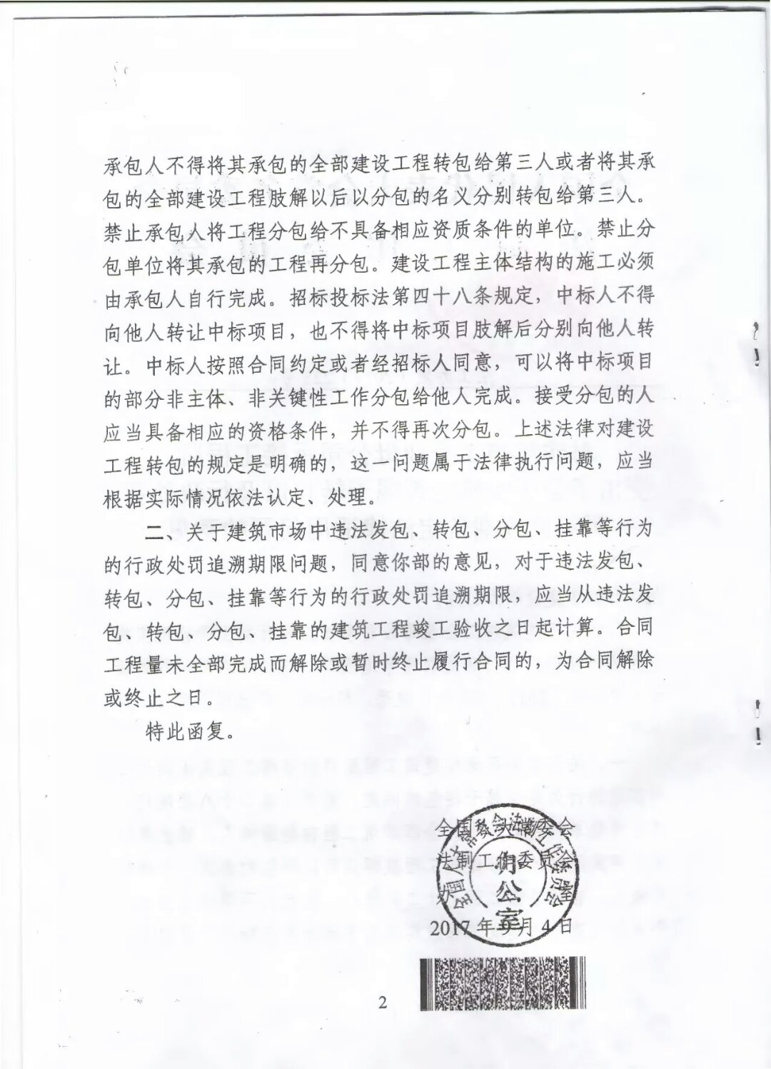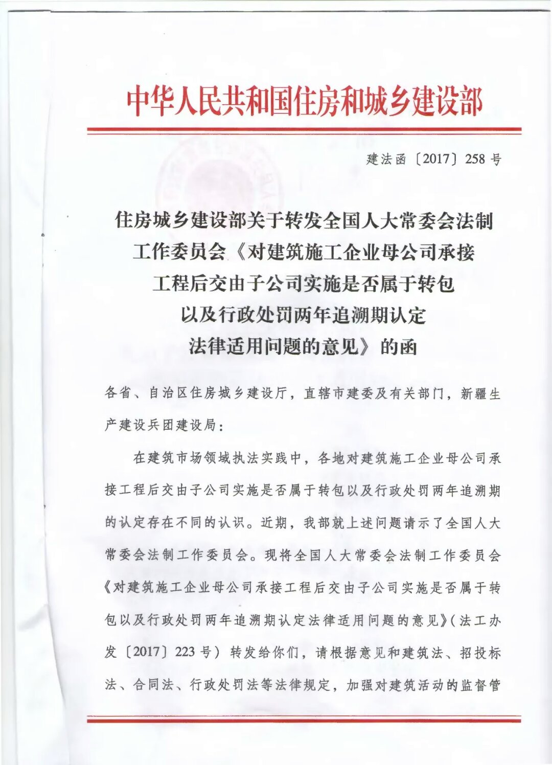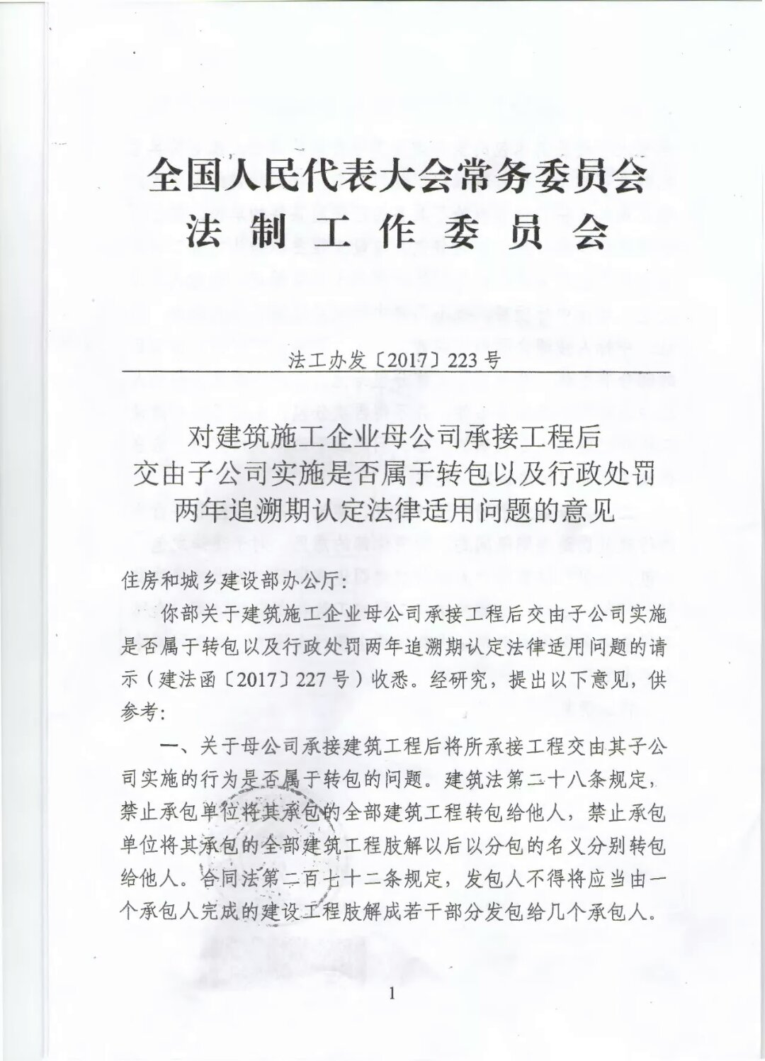 近日,住房與城鄉(xiāng)建設(shè)部向全國(guó)人大常委會(huì)法制工作委員會(huì)(下稱(chēng)“全國(guó)人大法工委”)發(fā)出請(qǐng)示函,全國(guó)人大法工委作出《對(duì)建筑施工企業(yè)母公司承接工程后交由子公司實(shí)施是否屬于轉(zhuǎn)包以及行政處罰兩年追溯期認(rèn)定法律適用問(wèn)題的意見(jiàn)》(法工辦發(fā)[2017]223號(hào),以下簡(jiǎn)稱(chēng)《意見(jiàn)》),其第一點(diǎn)認(rèn)為:
